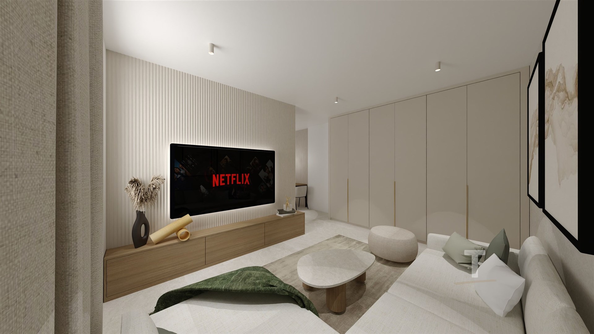 Byt je navržen s důrazem na vzdušnost a praktičnost. Otevřený obytný prostor s kuchyňským koutem přirozeně propojuje zónu pro vaření, práci i odpočinek. Velkoformátová okna zajišťují dostatek denního světla a příjemnou atmosféru. Promyšlené úložné prostory umožňují variabilní uspořádání interiéru podle vlastního stylu.