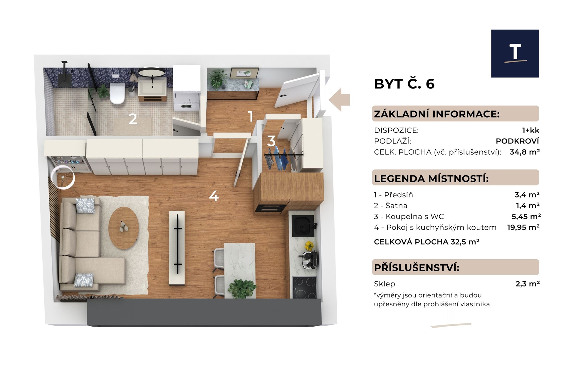 Byt je navržen s důrazem na vzdušnost a praktičnost. Otevřený obytný prostor s kuchyňským koutem přirozeně propojuje zónu pro vaření, práci i odpočinek. Velkoformátová okna zajišťují dostatek denního světla a příjemnou atmosféru. Promyšlené úložné prostory umožňují variabilní uspořádání interiéru podle vlastního stylu.