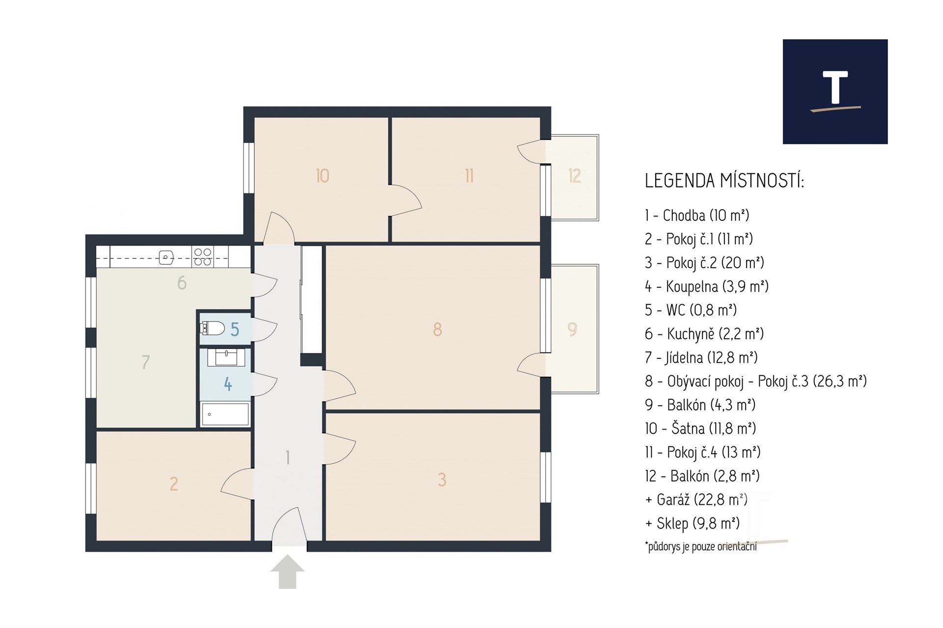 Dispozice bytu je následující: vstupní chodba (10 m2), pokoj č. 1 (20 m2), pokoj č. 2 (11 m2), pokoj č. 3 (26,3 m2) s balkonem (4,3 m2), koupelna (3,9 m2), samostatné WC (0,8 m2), kuchyně s jídelnou (15 m2), pokoj č. 4 (11,8 m2), pokoj č. 5 (13 m2) s balkonem (2,8 m2). Sklep (9,8 m2), garáž (22,8 m2). Celková užitná plocha bytu je 151 m2 včetně příslušenství (garáž, sklep).