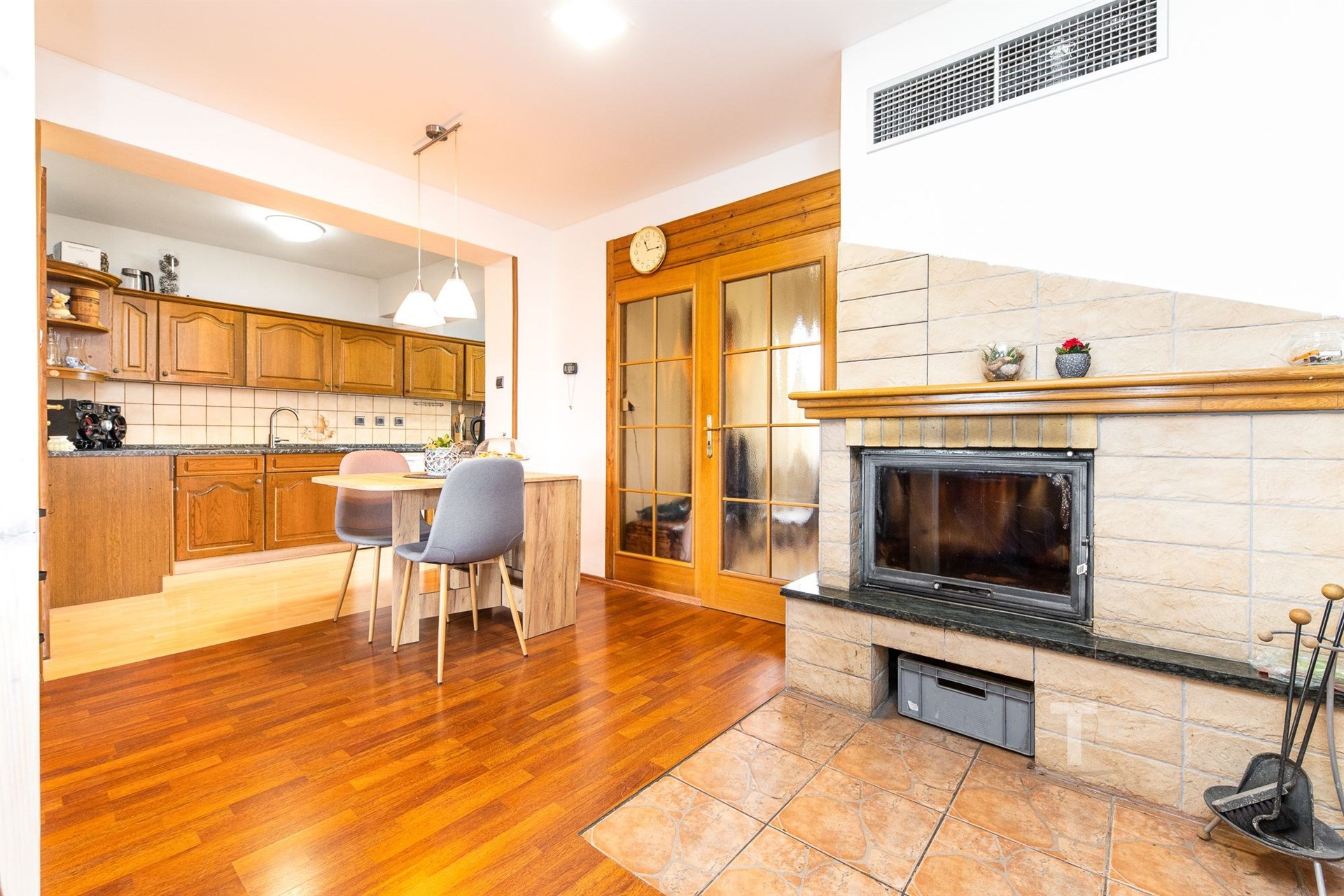 Vytápění domu zajišťuje plynový kotel, přičemž příjemnou atmosféru i další zdroj tepla nabízí krb s rozvodem tepla do jednotlivých místností. V podkroví je navíc instalována klimatizace, která zvyšuje komfort bydlení zejména v letních měsících.