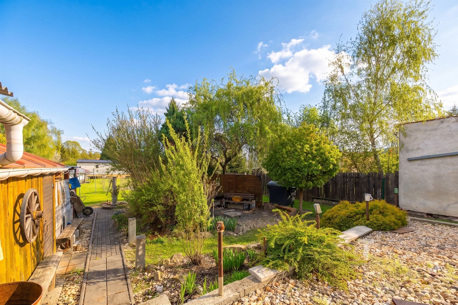 Velkou předností nemovitosti je rovinatá a udržovaná zahrada o celkové výměře 1104 m², která nabízí široké možnosti využití pro odpočinek, rodinné aktivity i případné další úpravy. Na zahradu je pohodlný přístup jak přímo z domu, tak i ze dvora.