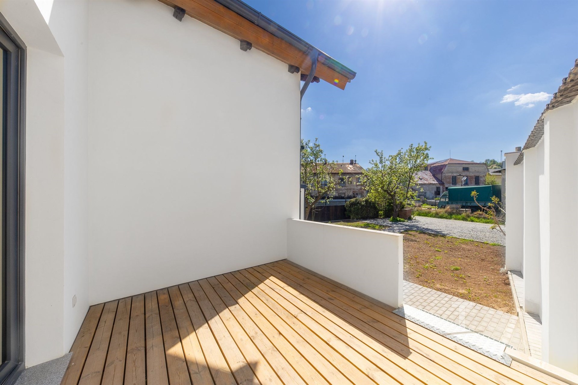 Dispozice: vstupními dveřmi vejdeme do společné předsíně (8,1 m2). Po pravé straně vejdeme do chodby (4,2 m2), kde najdeme vstup do ložnice (13,3 m2) a na samostatné WC (1,5 m2). Dále chodbou vejdeme do koupelny (4 m2). Po levé straně vstoupíme do obývacího pokoje s kuchyňským koutem (31,8 m2) se vstupem na terasu (10,6 m2). Z hlavního obytného prostoru je vstup do pokoje (10,6 m2). Ze zahrady je přístup do technické místnosti (5,7 m2), která je společná pro oba domy. Horní patro nyní o celkové ploše (78 m2).