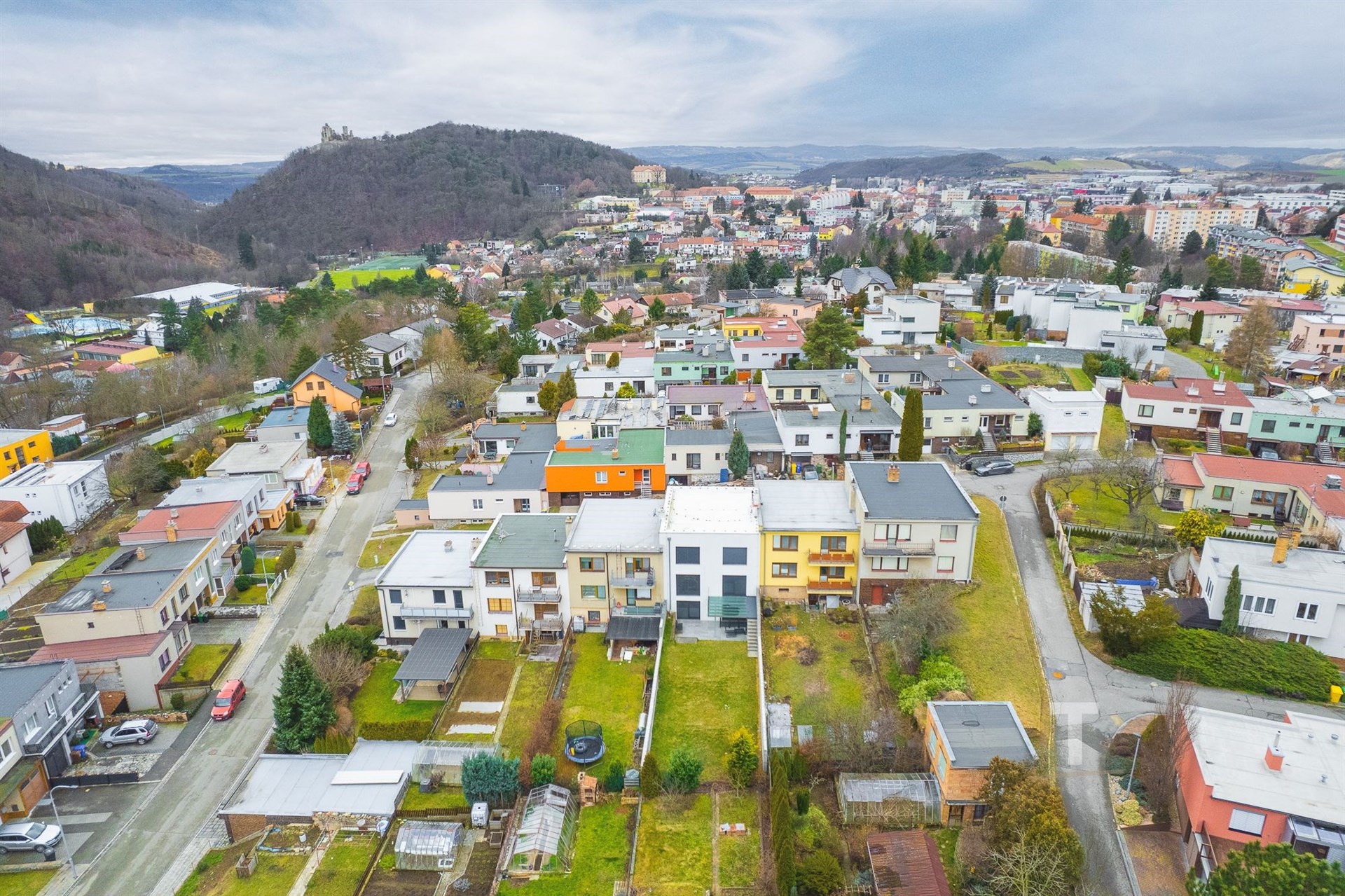 Nabízíme k pronájmu luxusní rodinný dům, který je řešen jako 5+1 se dvěma prostornými terasami a vinným sklepem. Je orientován východním a západním směrem. Celková výměra pozemku činí 347m2, užitná plocha domu je 260m2 včetně teras a balkonu. Jedná se o nemovitost, která působí zvenku diskrétním vzhledem, avšak jeho provedením, dispozicí, prosvětleností, použitými materiály a značkami osazených komponentů se jedná o záležitost velmi luxusní. Díky proskleným plochám jsou z něj nádherné výhledy do okolí. Interiér byl proveden dle návrhu studia Atmosféra Design Lenky Zimmermannové. Jedná se o klidnou část města, kdy umístění je mimo rušnou komunikaci. Ulicí projíždí pouze místní sousedi. Dům disponuje garáží pro motorku, kola či kočárek. Před domem se nachází parkovací stání pro 3 automobily. Třída energetické náročnosti je B. Dům prošel rozsáhlou rekonstrukcí v nadstandardním stylu, je vybaven kompletně zařízenou kuchyňskou linkou se spotřebiči, koupelnami na mírů, dále gauč v obývacím pokoji na míru, celá vstupní předsíň s vestavěným nábytkem a částečné vnitřní vybavení ložnice.