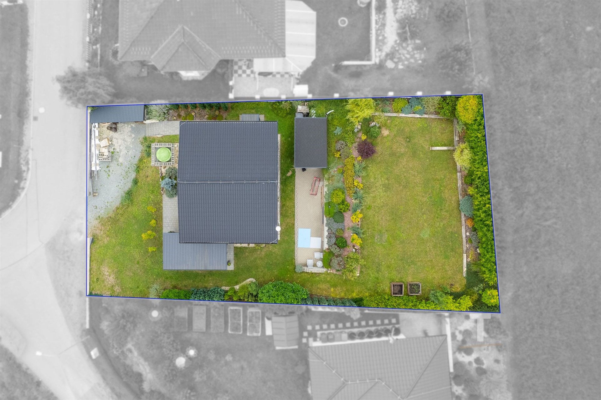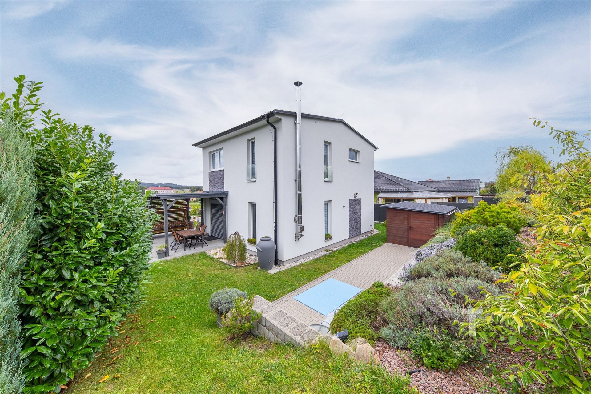 Pozemek o výměře 689 m² je upravený – zpevněné chodníky, terasa s pergolou, opěrná zeď, závětří u vstupu, oplocení. Součástí je také projekt na garáž pro dvě auta a další parkovací stání.
