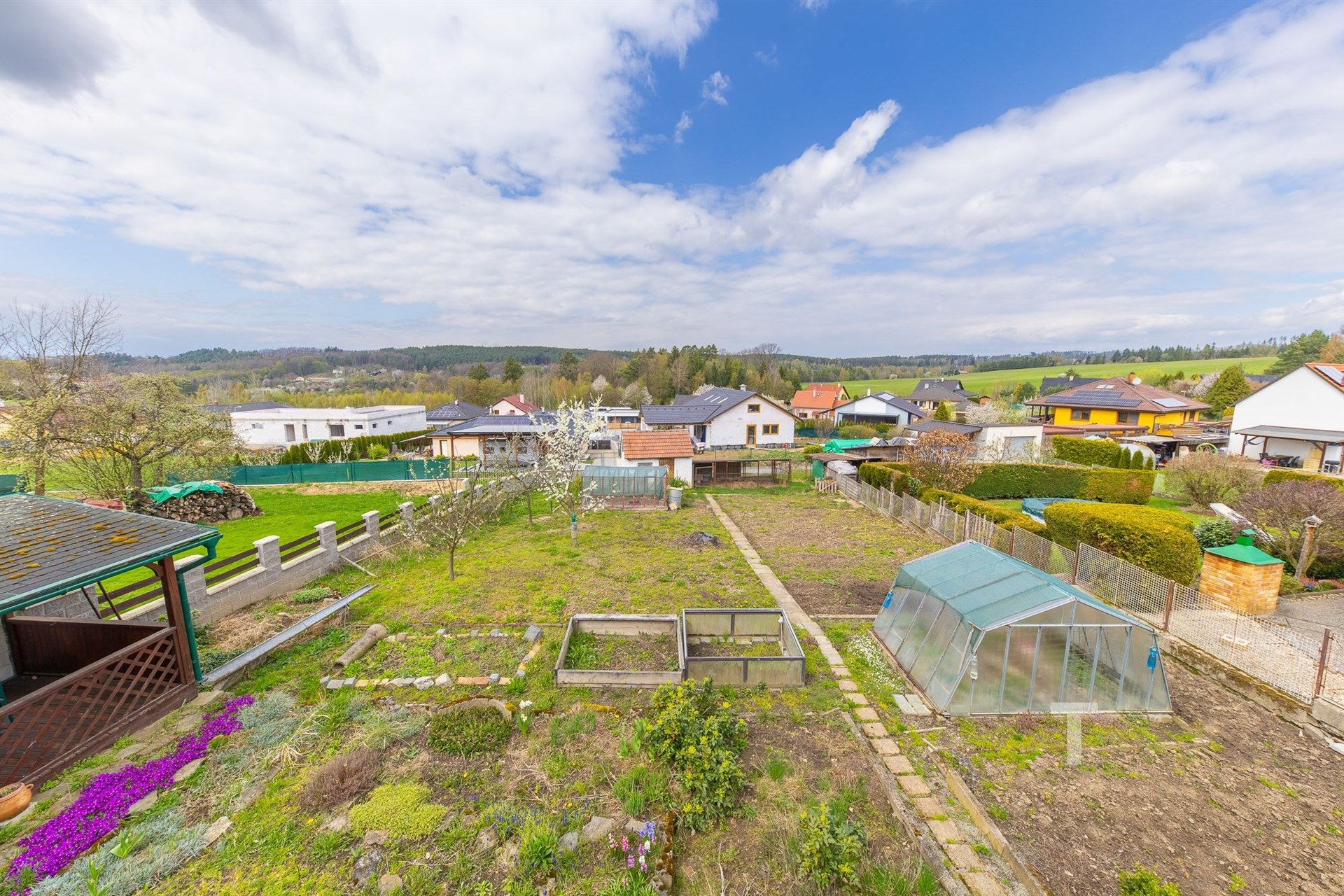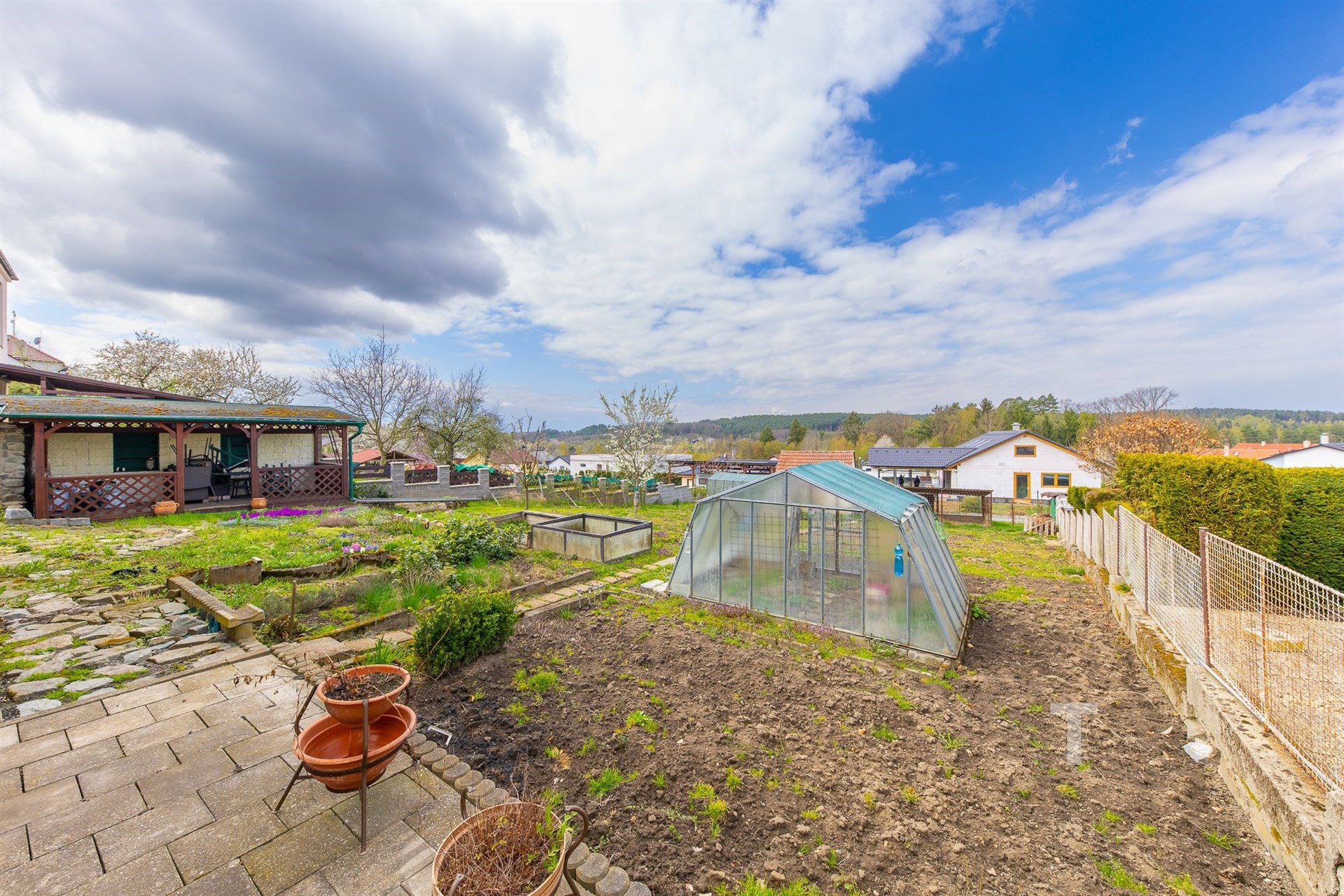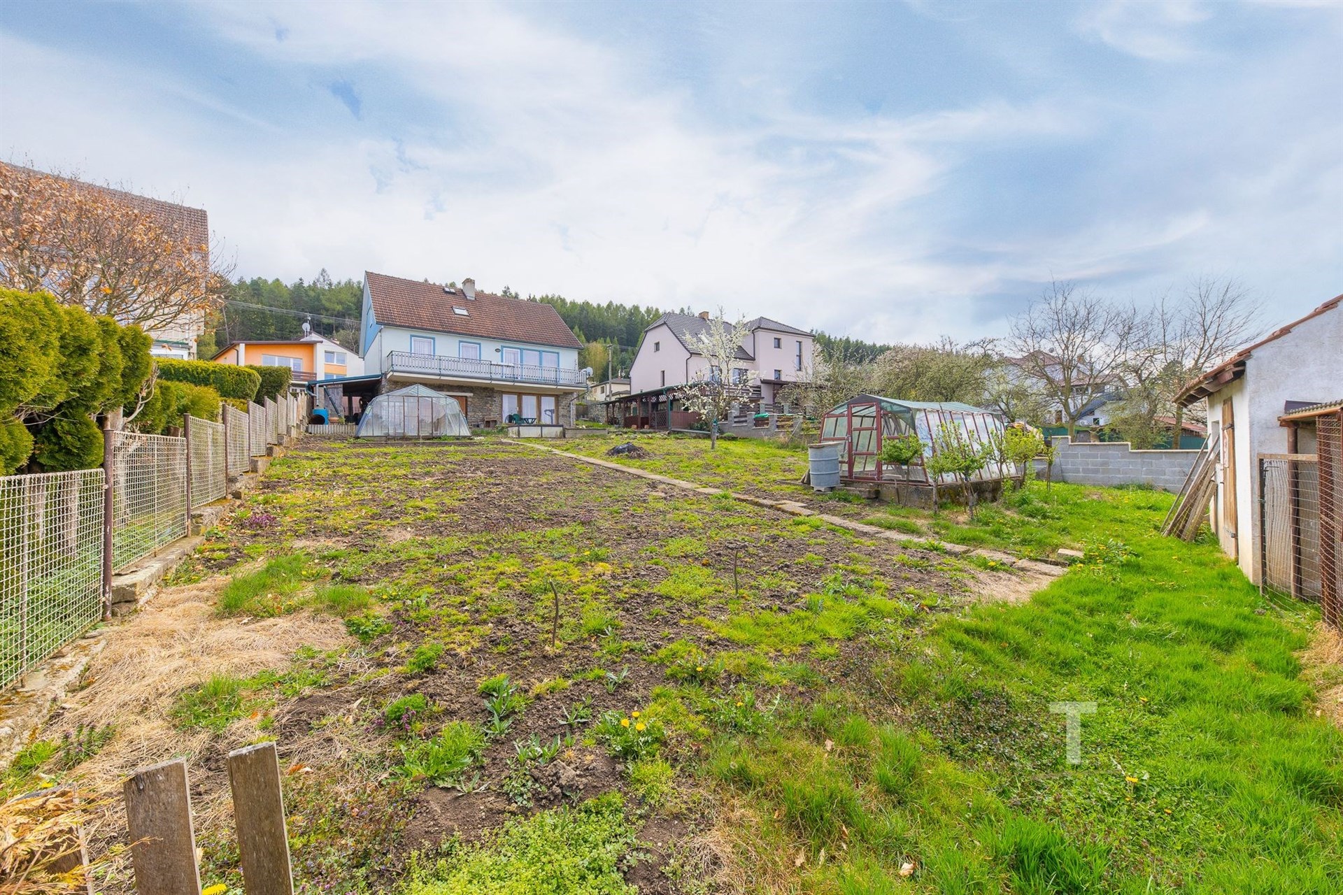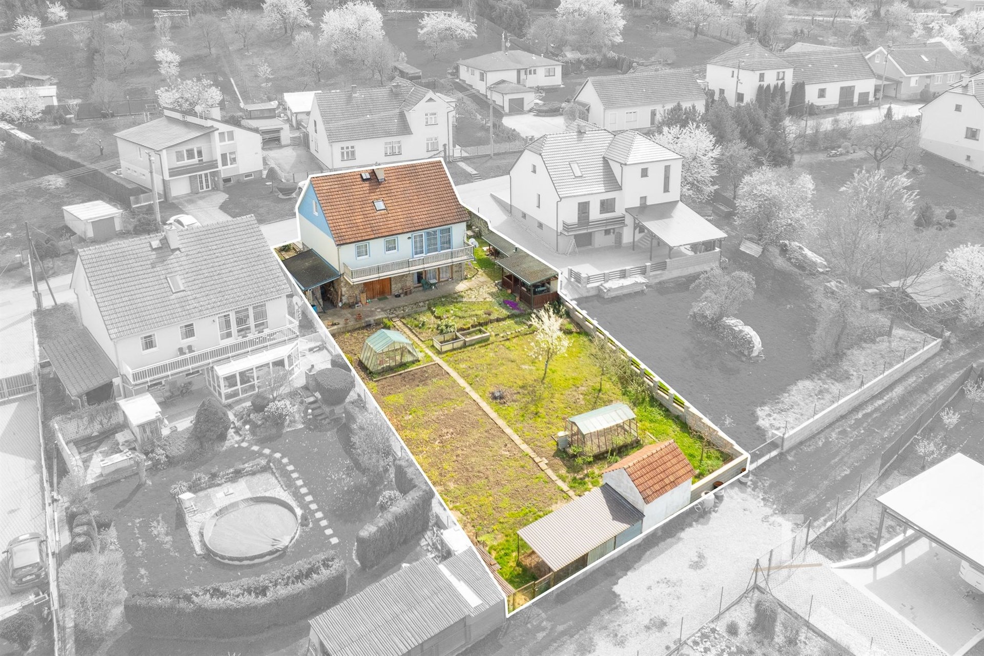 Celková plocha pozemku činí 822 m2, je oplocený, mírně svažitý. Na pozemku se také nachází “kurník” s oploceným výběhem pro slepice (6,5 m2), 2 skleníky, přístřešek na nářadí (15 m2) hned vedle domu a venkovní kryté posezení (13 m2). Na pozemku jsou ovocné stromy. Velkou výhodou je přístup na pozemek ze dvou stran. Přímo z ulice je možný vjezd a přístup je také ve spodní části u obecní cesty.