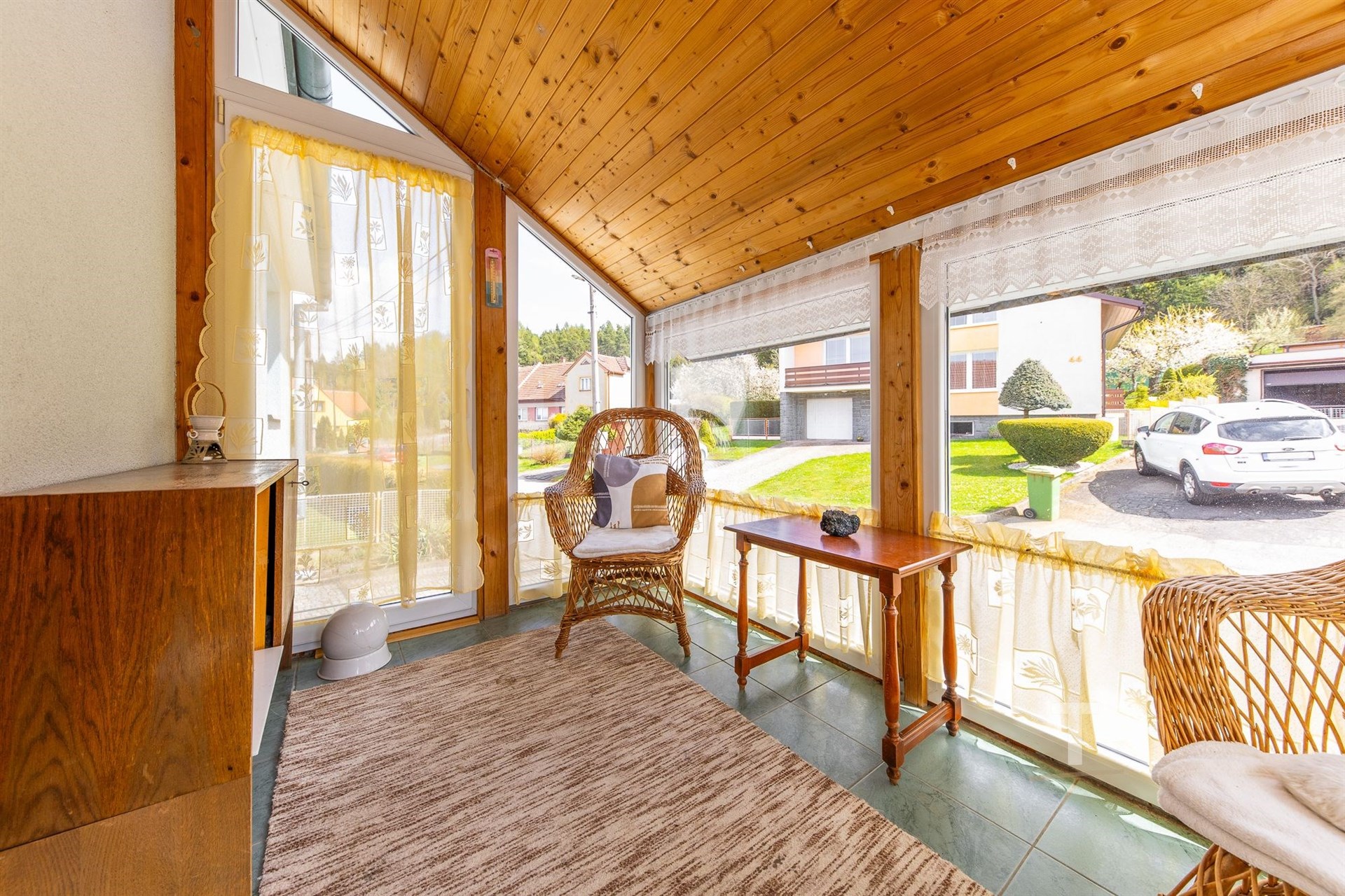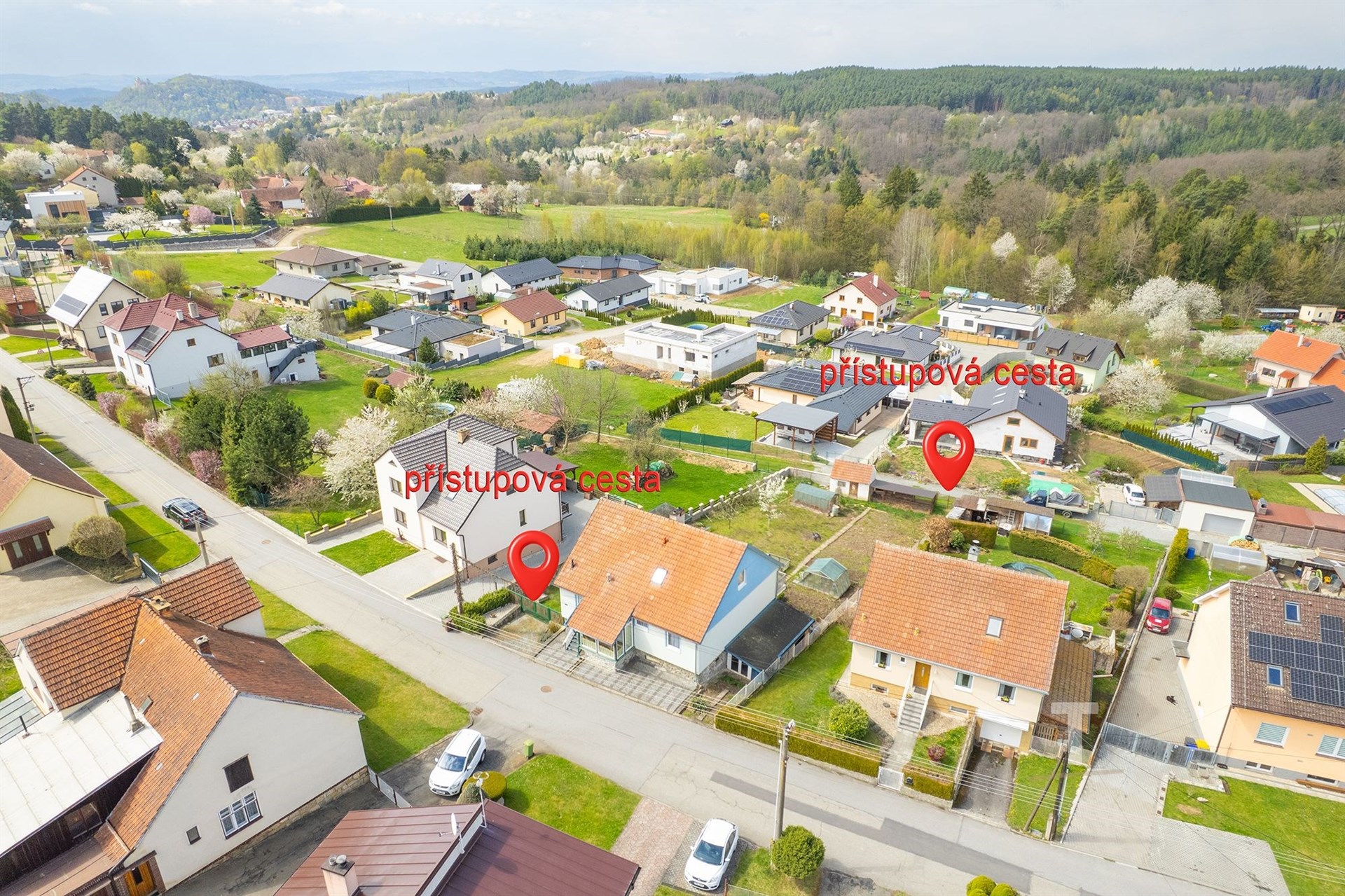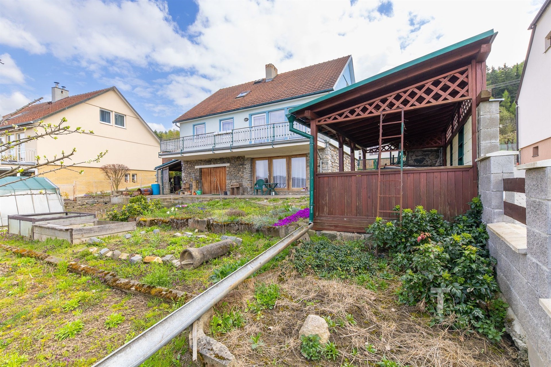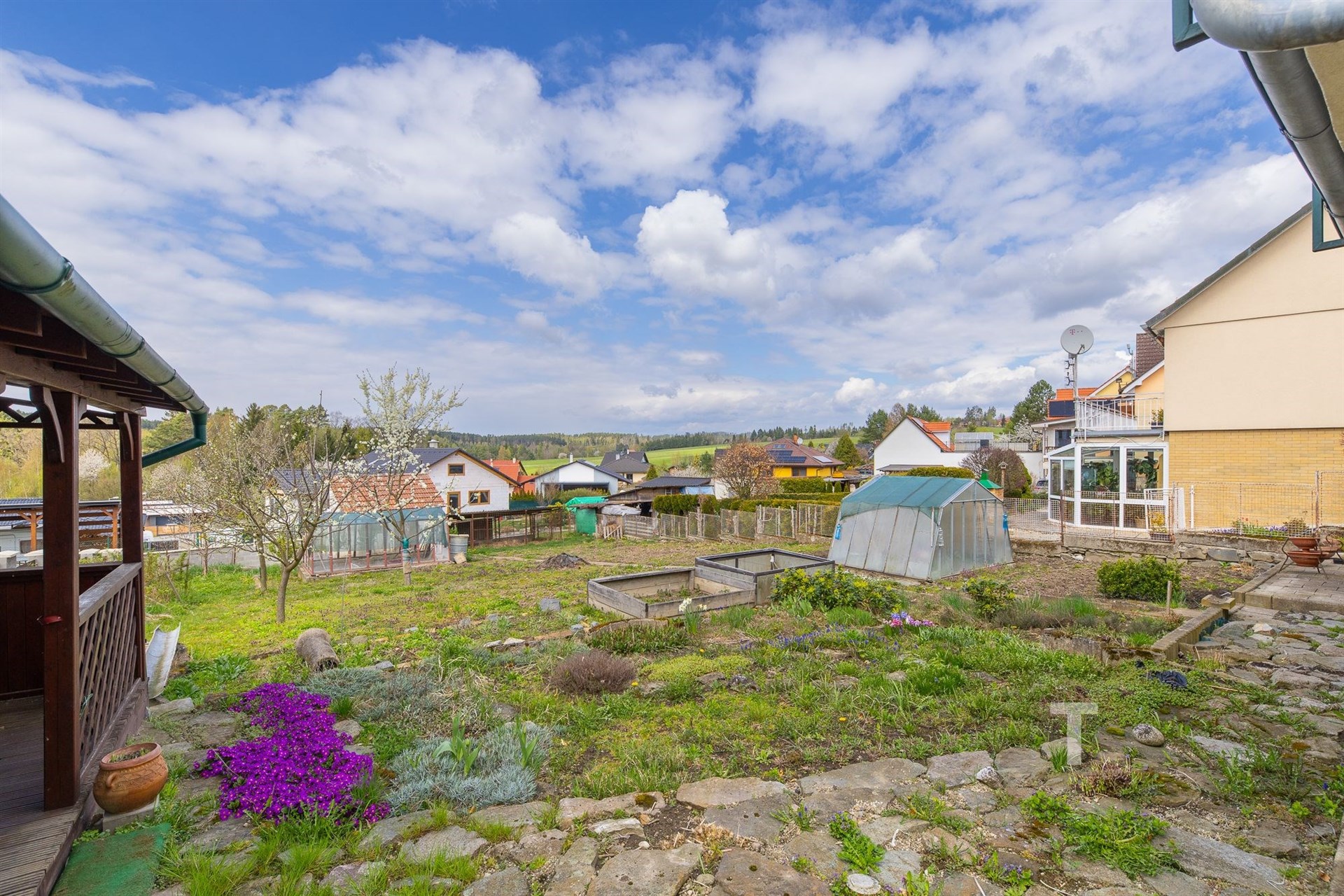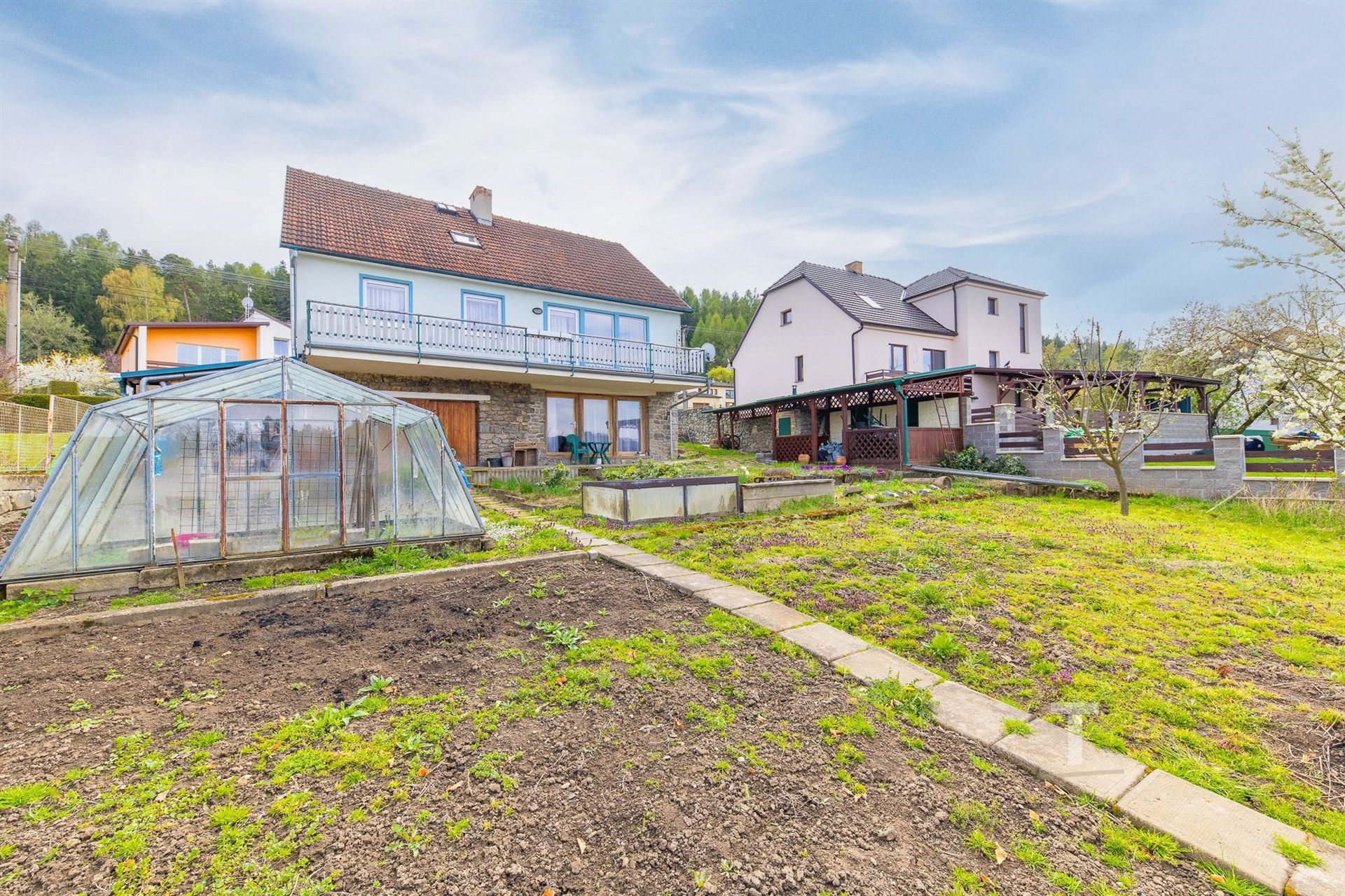Celková plocha pozemku činí 822 m2, je oplocený, mírně svažitý. Na pozemku se také nachází “kurník” s oploceným výběhem pro slepice (6,5 m2), 2 skleníky, přístřešek na nářadí (15 m2) hned vedle domu a venkovní kryté posezení (13 m2). Na pozemku jsou ovocné stromy. Velkou výhodou je přístup na pozemek ze dvou stran. Přímo z ulice je možný vjezd a přístup je také ve spodní části u obecní cesty.