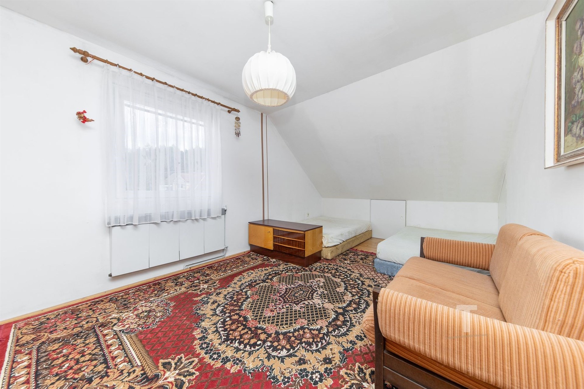 V podkroví se nachází chodba se schodištěm (5 m2), přístup do koupelny a WC (4,3 m2), dále do prostorného pokoje (27,5 m2) a kuchyňky (9,2 m2) a z ní pak do pokoje (17,5 m2).