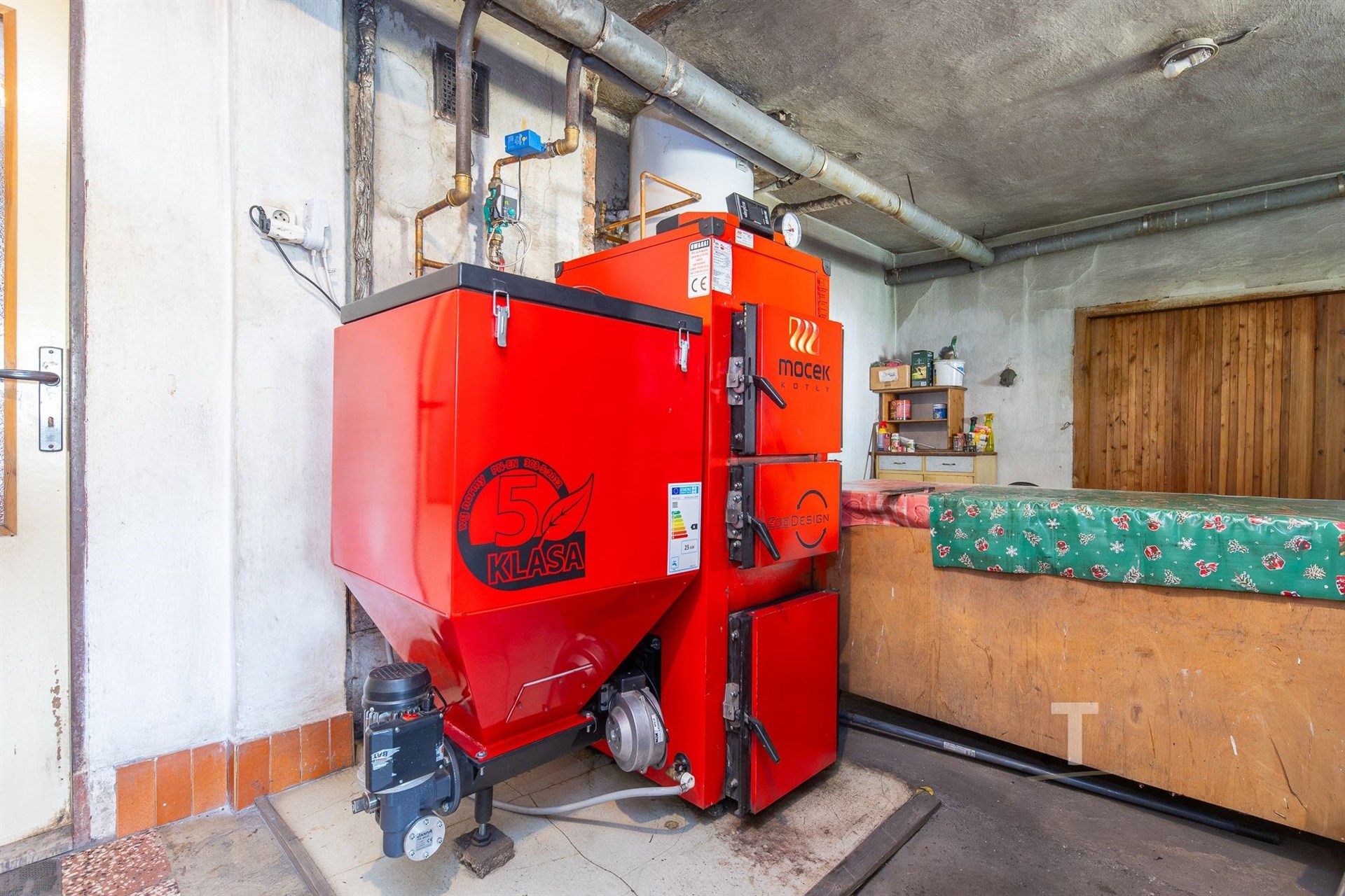 Vytápění domu je ústřední s kotlem na tuhá paliva, ohřev vody zajišťuje el. bojler. K dispozici jsou také krbová kamna. Samozřejmostí je napojení na veřejný vodovod, elektřinu a kanalizaci.