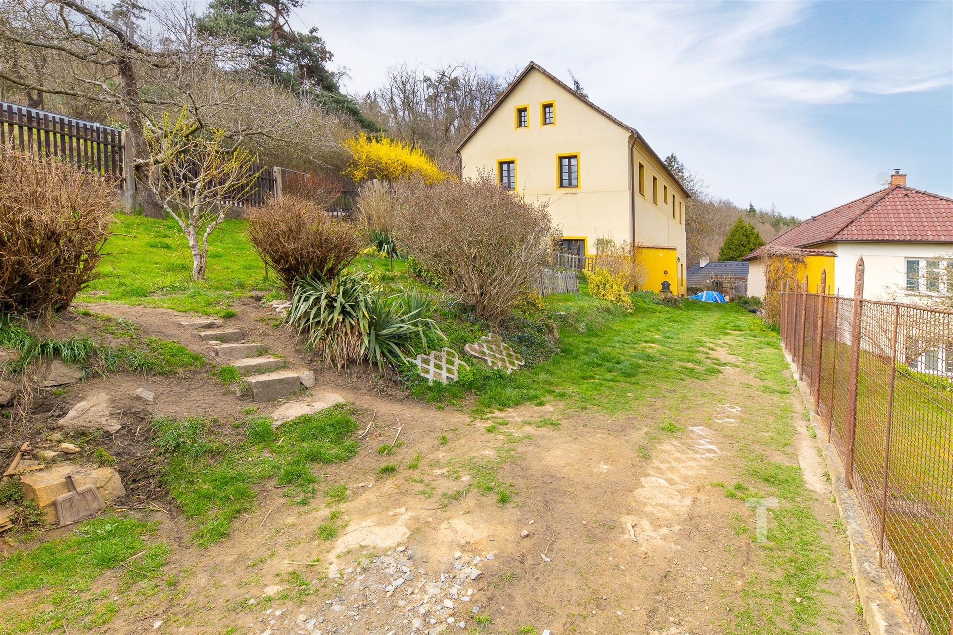 Pozemek je převážně rovinatý, celkově oplocený. Nacházejí se na něm ovocné stromy. Rozdělen je na přední část, kde je možno parkovat na vlastním pozemku za branou, boční část vedle domu, kde se nachází posezení v soukromí a dále poslední část pozemku za domem. Celková plocha pozemku činí 991 m2.