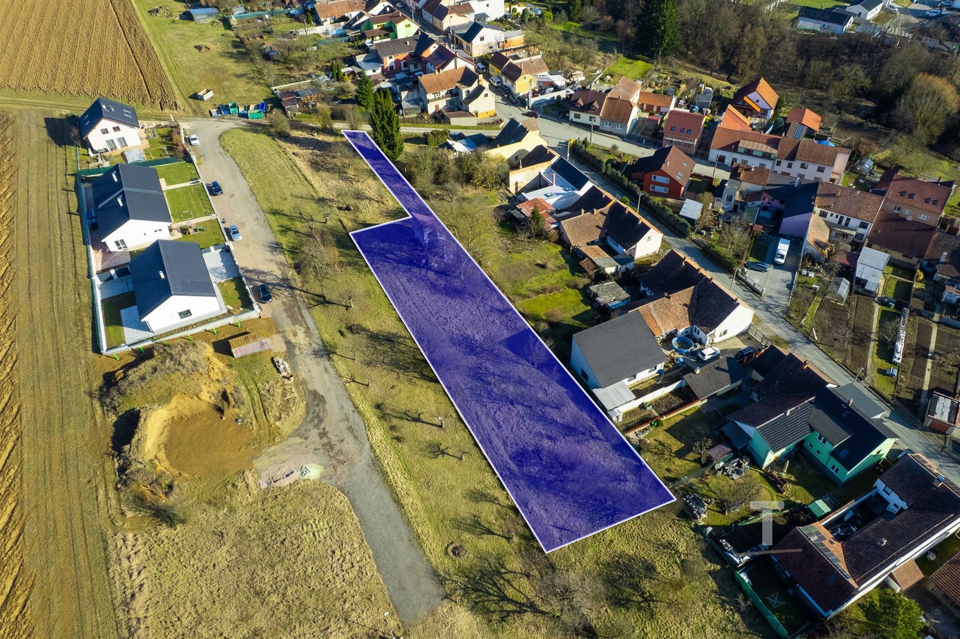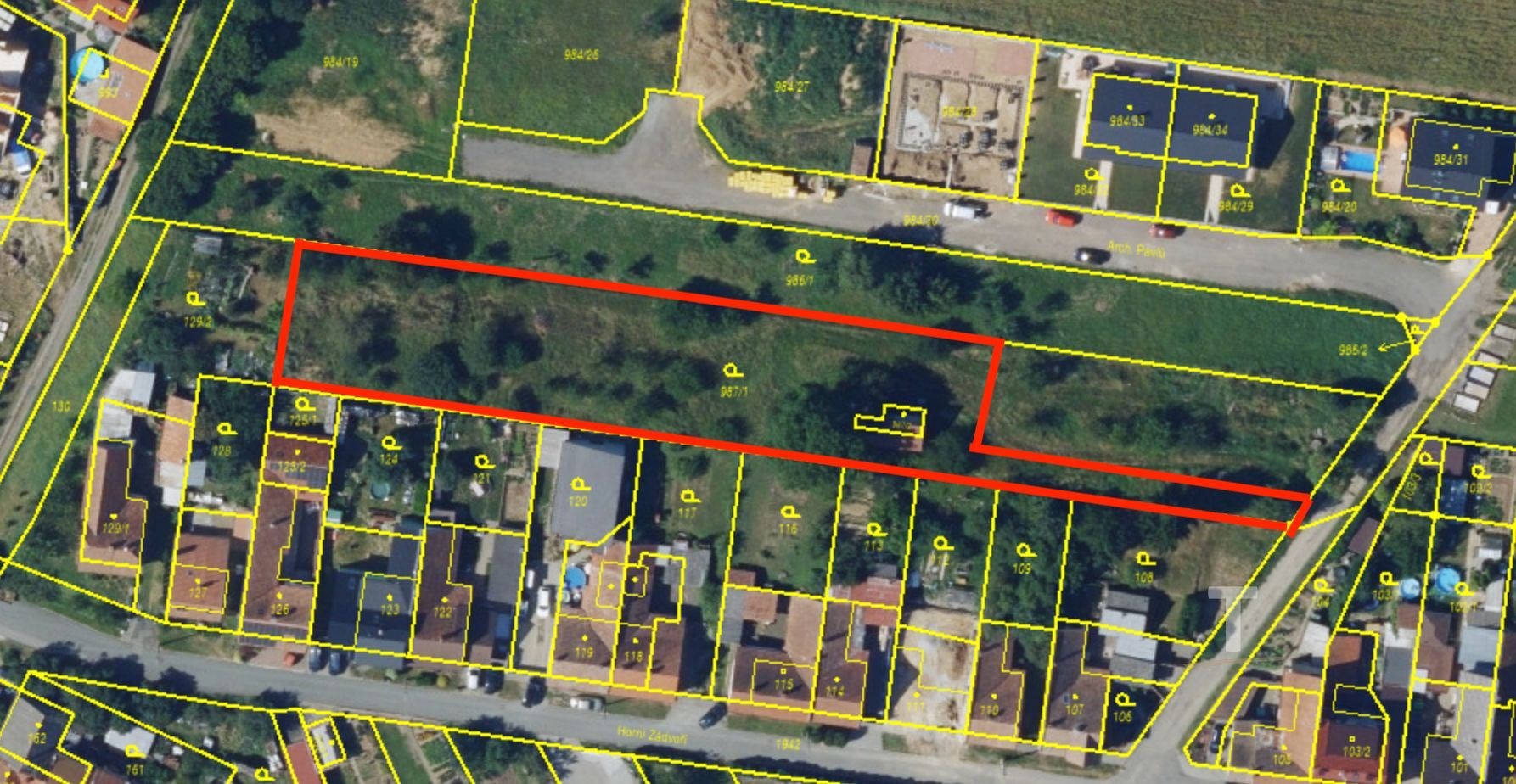 Pozemek je pravidelného, obdélníkového tvaru a jeho rozměry jsou cca 95 m délka a 21 m šířka. Šířka je tedy dostatečná pro stavbu rodinného domu na pozemku.