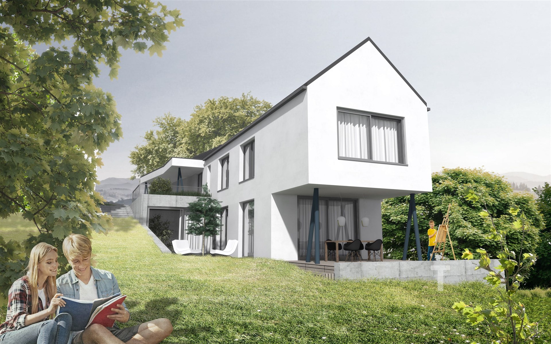 Součástí je projektová dokumentace moderního, dvoupodlažního rodinného domu se sedlovou střechou. Dům je dispozičně řešen jako 4+kk s garáží a zimní zahradou. Horní podlaží je v přední části tvořeno garáží. Vstup je navržen z jižní strany, na něj navazuje chodba se schodištěm do 1.PP. V horním podlaží se nachází klidová zóna domu, tedy dva dětské pokoje, ložnice a koupelna. V 1.PP je pak navržena denní zóna, tedy otevřený prostor obývacího pokoje, jídelny a kuchyně, na kterou navazuje terasa. Prostor doplňuje WC, technická místnost a zimní zahrada.