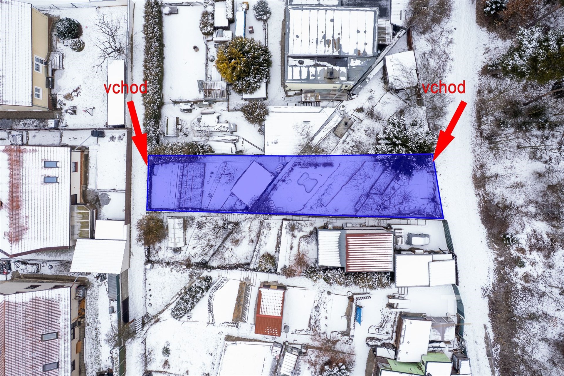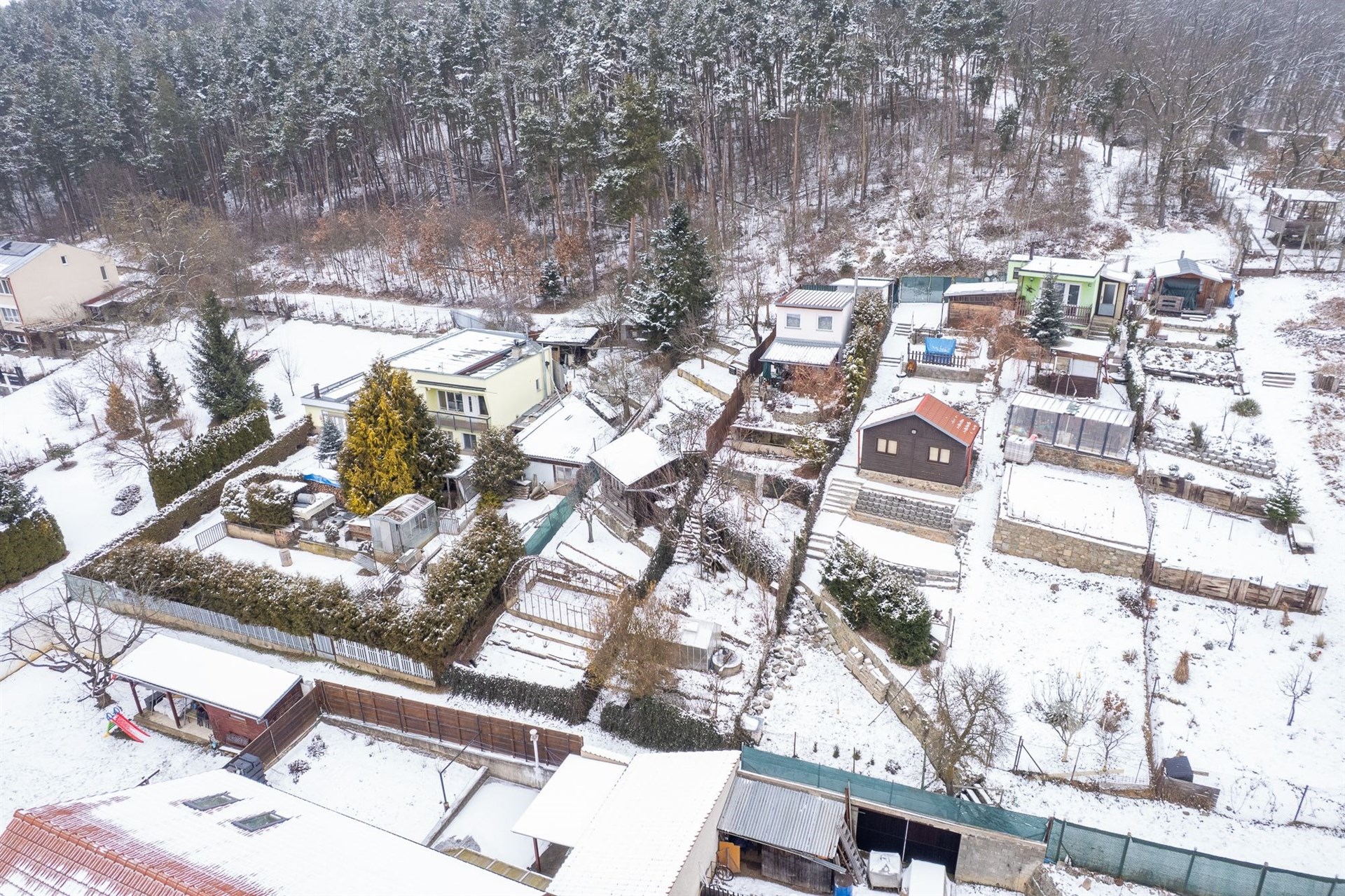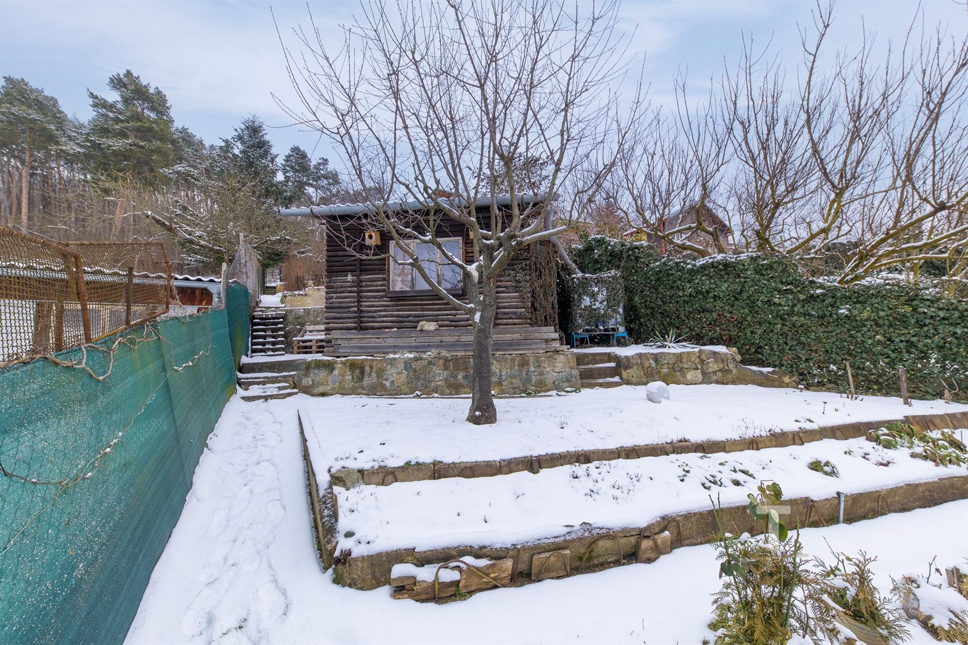 Zahrada má přístup z obou stran, což zajišťuje pohodlný přístup a lepší využitelnost pozemku. Na zahradě se nachází dřevěná chatka, která může sloužit k odpočinku, uskladnění nářadí nebo jako zázemí pro víkendové pobyty. Velkou výhodou je možnost napojení na obecní vodovod i elektřinu. V okolí jsou chaty i rodinné domy.